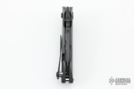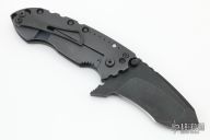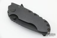 This S-90 Flipper by Direware Custom Knives features a black compound ground blade, notched thumbrest, and flipper. The handle has a black titanium frame with a black tip-up clip. Great blade seating, detent and lock up. Excellent condition.
