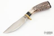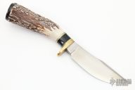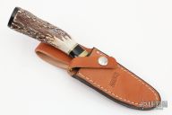 This Woodcraft by Marbles features a satin finished blade, .213" blade stock and 1.260" blade depth, hidden tang construction. The handle has a brass guard with stag grip and  buffalo/brass/white spacers and buffalo butt cap. Comes with original box and brown leather sheath. Excellent condition.