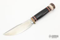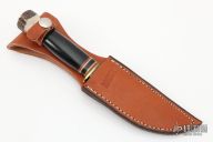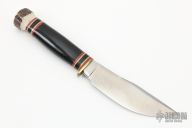 This Woodcraft by Marbles features a satin finished blade, .210" blade stock and 1.284" blade depth, hidden tang construction. The handle has a brass guard with buffalo grip and  red/white/brass/black spacers and stag butt cap. Comes with original box and brown leather sheath. Excellent condition.