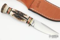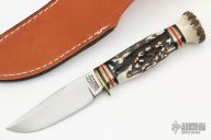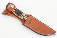 This Handy by Marbles features a satin finished blade, .166" blade stock and .993" blade depth, hidden/mortise tang construction. The handle has a brass guard with a stag grip and black/brass/white/red spacers and stag butt cap. Comes with original box and brown leather sheath. Excellent condition.