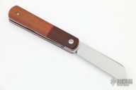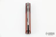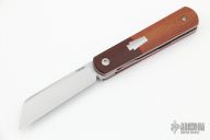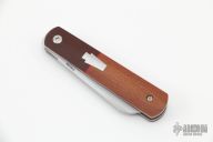 This Barlow Front Flipper Linerlock by Enrique Pena features a hand rub satin finished blade with front flipper and notched thumbrest. The handle has brown canvas micarta bolsters, micarta scales with a stainless steel escutcheon, red liners, titanium liners and natural canvas micarta backspacer. Excellent Condition.