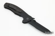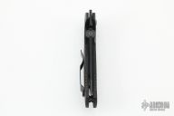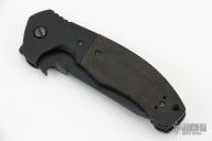 This Po-Boy Roadhouse has a black partially serrated blade with a thumbdisc and wave feature. #890 and dated 2014. The handle has dovetailed black titanium bolsters and black canvas micarta scales, black titanium liners and stainless steel tip up clip. Nice lockup and blade seating. Excellent condition. Comes with a zippered case.