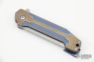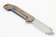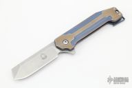This GMT Razel GT Mid-Tech by Jon Graham features a stonewashed blade with flipper. The handle has an anodized and orange peel finished titanium frame with matching tip up tail clip, satin finished lockbar stabilizer. Comes with a cloth pouch. Excellent condition. Rides on bearings, nice detent, lockup and blade seating.