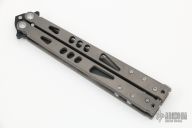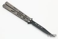 This Tachyon II balisong by Microtech has a black clip point blade. The handle has skeletonized bead blast titanium handles with T-latch. Includes a Velcro case. Dated 01/2013 and s/n 00530. Has some scuffs, otherwise good condition.
