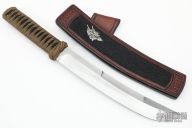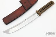 This tanto by Lamont Coombs Jr features an upswept blade with false top edge and nice hamon, .245" blade stock and 1.335" blade depth, hidden tang construction. The handle has epoxied cord wrap over black stingray skin. Comes with a hand tooled brown leather sheath with stingray skin inlay. Comes with a zippered case. Excellent condition.