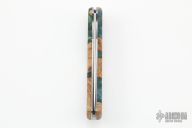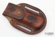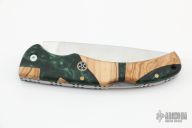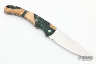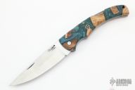 This lockback by Hayta Knives features a satin finished blade with nail nick. The handle has hybrid wood scales, stainless steel liners with fileworked spines and a stainless steel backspacer. Comes with a hand tooled brown leather sheath. New from maker.