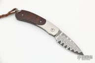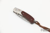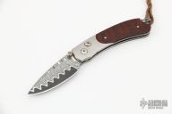 This B09-SZD Rio by William Henry features a "Wave" Damascus steel blade featuring a ZDP-189 core. The handle has a titanium frame with snakewood scales. All fittings are stainless steel and the lanyard bail is sterling silver. Thumbstud and lock button are inset with a yellow citrine gemstone. Comes with original box, papers, and leather pouch. Excellent condition.