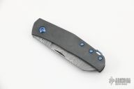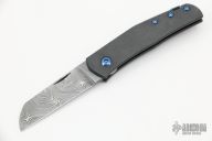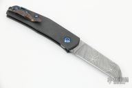This Monte Carlo by Jens Anso features a Damasteel sheepsfoot style blade with nail nick. The handle is comprised of spiral scratch finished zirconium scales over dual inlaid liners with double detent that provides a crisp click in the open, closed and half stop positions. Titanium backspacer with lanyard bail and a timascus tip up clip. Includes original box, a leather slip sheath and COA dated April 2022. Excellent condition.