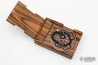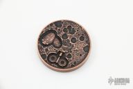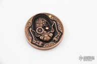 This Trilobite Construction Kit Challenge Coin by Tom Sterling is 1 15/16" in diameter by 1/4" thick (49.2mm x 6.35mm). This challenge coin is created by Tom Sterling through a unique technique of machining combined with hand carving and hand engraving, each method carefully chosen for its own best effect. This unique pocket art is created from an unusual tellurium copper alloy specially formulated for excellent carving characteristics and it's lovely copper color. Multiple 24kt hand engraved inlays grace the work. Magnetic closure bocote wood display and storage box. Comes with COA. New from maker.