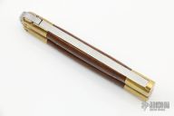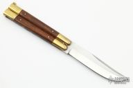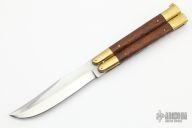 This balisong from the Philippines features a clip point blade with a satin polished blade. The handle has brass bolsters, steel channel/liners, wood scales, brass T-latch. Has some scratches, otherwise good condition.