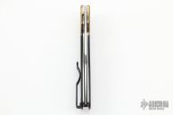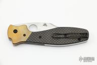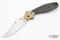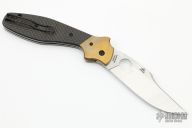 This C190CFP Ed Schempp Bowie Folder by Spyderco features a satin finished clip point blade with swedge and thumb hole. The handle is comprised of dovetailed brass bolsters and carbon fiber/G10 laminate scales over steel liners and backspacer. The reversible deep carry wire clip is positioned for tip up carry. Comes with original box and papers. Has some light scratches, otherwise excellent condition.