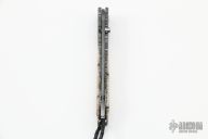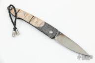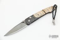 The B10 "Hieroglyph" by William Henry features a "Wave" San Mai Damascus blade with single thumbstud with white topaz inset in gold bezel. The frame is Chad Nichols "Rolling Rock" Damascus with mammoth tooth scales, white topaz set in gold bezel the button. Includes wooden presentation box, leather pouch, and all paperwork dated April 29, 2015. Excellent condition. #242/250
