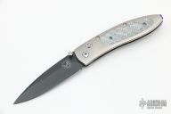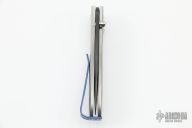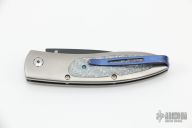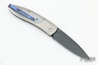This Monarch Nano by William Henry features a black coated San Mai blade with ZDP-189 core, single thumbstud with a blue topaz inset, matching button lock. The handle has an orange peel finished titanium frame with silver twill inlays with blue anodized screws and tip up clip. Comes with original box and COA dated April 28, 2014. Excellent condition.