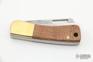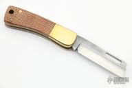 This Chunky Frank by K'roo Knives features a hand rub satin finished blade with nail nick slot that goes all the way through the blade, textured flats. The handle has brass bolsters, burlap micarta covers with brass pins, liners, and stainless spring. Nice snap when opened and closed, nice blade seating and spring is flush in both positions. Comes with zippered case. Has some light scuffs and scratches, otherwise excellent condition.