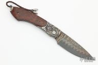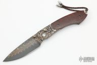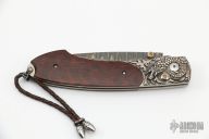 This B12 Dragon Fire by William Henry features a "Copper Wave" Damascus blade with VG-5 core, single thumbstud with a citrine set in a gold bezel. The handle has a hand carved sterling silver frame with a citrine set in gold bezel in the button release, snakewood scales, sterling silver lanyard beads on a braided blade leather lanyard. Comes with original Box, pocket sheath and COA dated July 17, 2014. Excellent condition.