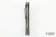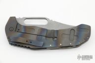 This Large Framelock by Mikkel Willumsen features a stonewashed recurve blade with notched thumbrest and long thumbhole and jumping on spine. The handle has a textured jade G-10 front scale with bead blast and anodized finished titanium lockside with matching titanium tip up clip, G-10 backspacer. Light detent, nice lockup and blade seating. Comes with a zippered case. Excellent condition.