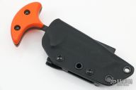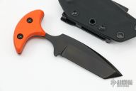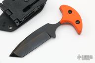 This push dagger by Terry Guinn features a DLC finished drop point tanto blade with false top edge, .183" blade stock and 1.07" blade depth, full tang construction with orange g10 scales. Comes with a kydex sheath with teklok. Excellent condition.