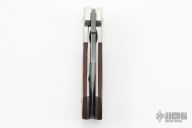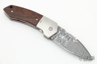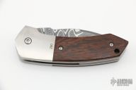 This year's annual Damascus collector's knife is based on one of Jens Ansø's models, the Solo. To make this a real collectible piece, we chose handsome desert ironwood for the handle, which is accented with the brushed stainless steel bolsters and solid stainless steel liners. Chad Nichols' stainless "Riptide Damascus" provides an attractive contrast and unique appearance. This valuable collector's piece is handmade in Solingen, Germany and is strictly limited to just 999 pieces worldwide. Comes in an attractive wooden presentation box with a certificate of authenticity. Comes with original box and papers. Excellent condition.