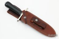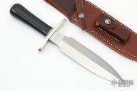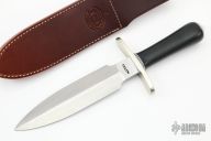This Tom Clinton Special by Randall Made Knives has a double-edged stainless steel satin finished blade, 228" blade stock and 1.635" blade depth, hidden tang construction. The handle has a forward curved nickel silver guard, black linen micarta grip with a duralumin butt. Comes with a brown leather sheath and original paper wrapping. New from maker!