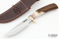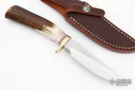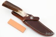This Model 7-4.5 from Randall Made Knives features a satin finish clip point blade with .157" blade stock and 1.039" blade depth, hidden tang construction. The handle is comprised of a brass guard, stag grip with red/white/blue spacers. Comes with brown leather sheath and original paper wrapping. New from maker.