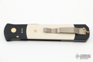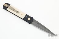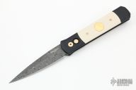 This Godfather Tuxedo by Protech features Chad Nichols Damascus blade and a black aluminum handle with ivory paper micarta scales and a 1/10 oz solid gold American Eagle coin inlay. Gold plate hardware and push button, gold anodized titanium clip, tip up carry. The handle is marked with #8 of 20of this limited edition. Comes with original box. Excellent condition.