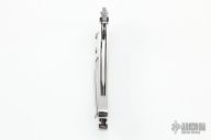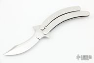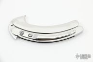 This Mini Szabofly is a Laci Szabo design executed by Fred Perrin and features a mirror polished blade and mirror polished stainless handles. These are discontinued and will not be produced again. Comes with a zipper case. There are scuffs and scratches throughout, otherwise great condition.