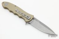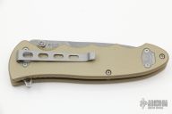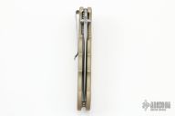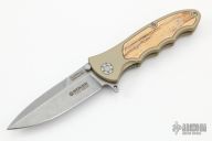 This Turbine Linerlock Flipper by Boker was produced to commemorate 10,000 fans on their Facebook page. It has a stonewashed X-15 TN stainless steel drop/ spear point blade with dual thumb studs and false top edge. Handle is tan aluminum with wood insert on the A-side, barrel spacers, titanium single liner (lock), and bead blasted 2-way reversible stainless steel clip. Excellent condition. Comes with original box and paperwork. Blade Steel: X-15 T.N.