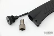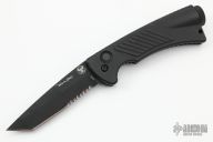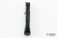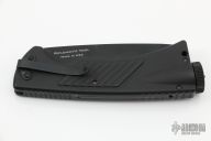 The Blackie Collins Rifleman from Meyerco is an automatic knife that has tools to service AR style platforms. The 6061-T6 aluminum handle has a threaded aluminum cap with a magnesium fire starter and sight adjustment tool. Tucked neatly into the spine of the handle is a stainless steel cartridge extraction tool with DLC coating. The extractor is held in place with the pressure fit from the machined aluminum cap that screws into the handle. This knife also features a 154-CM stainless steel tanto blade (partially serrated), tip-down pocket clip and tungsten carbide glass breaker tip.