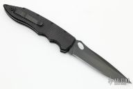 The Predator side opening auto by Piranha Knives features a black finish drop point blade, ribbed aircraft aluminum handle, and a black titanium pocket clip. Fires smoothly. Comes with original box and drawstring pouch. Excellent condition.