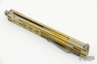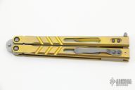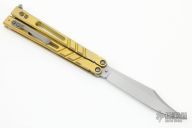 This Alpha Beast Balisong from Blade Runner Systems (BRS) features a bead blast finished clip point blade. The handle has a millled and anodized titanium, has a T-latch. Comes with original zippered case and papers. Has a couple light scratches, otherwise excellent condition.