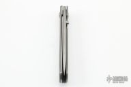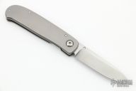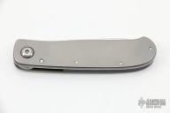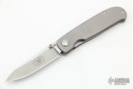 This 50th anniversary linerlock folder by Bob Terzuola features a fine bead blasted and satin finished drop point blade and a titanium frame with a bead blast finish. Bead Blast titanium frame and clip, tip up carry. Has a gold inset stamped "50" in the ricasso. Smooth action. Solid lockup, blade seating and detent. Excellent work. Comes with a soft pouch. Has a couple dings in the frame and some slight marring on the hardware. Otherwise excellent condition.
