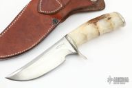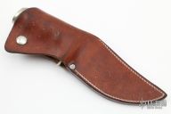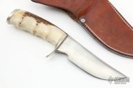 This skinner by Clyde Fischer features a satin finished upswept blade, .267" blade stock and 1.411" blade depth, hidden tang construction. The handle has a nickel silver guard and butt and a stag grip with finger grips. Comes with a brown leather sheath with belt loop. Has some light scratches otherwise good condition for its age.