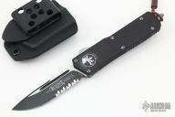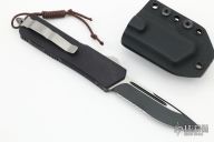 This Scarab OTF auto by Microtech has a S/E partially serrated blade with a black finish and fullers. The handle is black aluminum with a single glass breaker. Dated 05/2015 and serial number 14773. Comes with a custom kydex sheath with belt clip. Has scuffs on the handle, otherwise excellent condition.