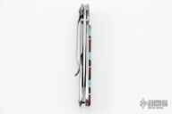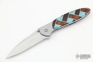 This Kershaw assisted opening flipper has been customized by Santa Fe Stoneworks, it features a bead blast blade and back side of the stainless steel frame. Desert Ironwood and turquoise scale on front of handle, tip up or down reversible stainless steel clip. Nice lock up, blade seating and detent. Excellent Condition.