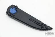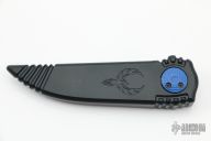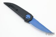 This Phoenix model sports a black handle with a phoenix laser etching and a CPM-S30V steel blade with a blue cerakote finish. The top edge of the knife has been sharpened with a partially serrated cutting edge.