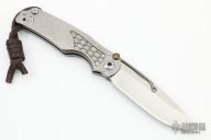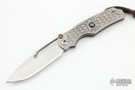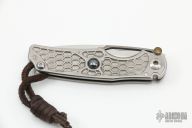 Much like the original Ti-Lock, this knife has a full tumbled titanium handle. For this limited yearly graphic though, Chris Reeve chose to mill a honeycomb pattern into both sides of the frame and inlaid a round piece of hematite on the front scale and dubbed it "Elemental". Another Hawk invention, a clothespin style clip is affixed to the rear of the knife for tip up right handed carry.