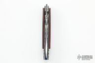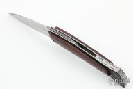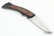 "I started making knives over 30 years ago while at University. My first knife was a big Bowie made from a car spring and I obtained a piece of stag from the local zoo for the handle. I still have and treasure that first knife. In my younger days I was very involved in martial arts yet could not buy Japanese weapons to train with, so I made my own, a short sword called a "sai". My fellow students were enthralled and I began taking orders to make more. Although having earned two university degrees, I continued to make knives part-time, but it became such a passion that I left my profession and am now a full-time knifemaking artist. I have been a member of the South African Knifemakers Guild since 1985. Today I only make folders and automatics, using the best exotic materials such as mammoth ivory, pearl, damascus and damasteel. All my folders have fileworked liners and backstraps, each folder has a jewel inlaid somewhere on the knife as well as in the thumbstud."