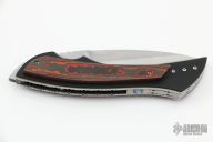 This B Ware flipper by Corrie Shoeman features a San Mai Damascus blade with false top edge, fileworked thumb and finger rests. The handle has red/black fat carbon scales over black G-10, fileworked and orange peel finished titanium liners, fileworked titanium backspacer with anodized filework and abalone inlay. Rides on caged bearings, nice detent, lockup and blade seating. Comes with a zippered case. Has scratches on the blade, otherwise great condition.