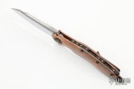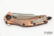 This Marfione Custom Matrix features a mirror finished blade with bead blast cut-outs and satin flats, has notched thumbrest and flipper. The handle has a copper frame with a satin and bronze finished titanium clip and lockbar, ringed copper hardware and backspacer. Comes with zippered case, original box and COA. Dated 11/2015. Excellent condition.