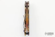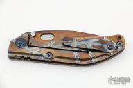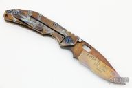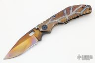 This DDC BBNM by Duane Dwyer features a bronze/purple SM-100 blade with thumbhole. The handle has a milled and flame finished titanium frame with a matching tip up titanium clip, anodized titanium hardware. Nice detent, lockup and blade seating. Excellent condition. Comes with velcro case and COA. This one has the 2nd Amendment laser engraved on the handle.