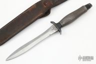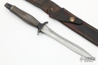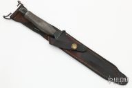 The Mark II is one of the best selling knives of all time. First introduced in 1966, this tactical knife is serialized for collectors. This one has a satin finished hand ground double edged blade, .234" blade stock and .933" blade depth, hidden tang construction with a black/grey aluminum handle. This knife is Serial #008302 and was made in 1968. Comes with a brown leather sheath. Has some wear on the handle finish, some scratches and light patina, has been resharpened, fair condition for its age.