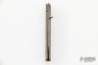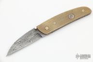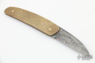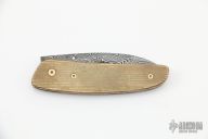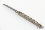 This linerlock features a Damascus blade with a single thumbstud with mother of pearl inlay. The handle has mokume scales with the markers mark inlaid in the front scale, fileworked titanium liners, Damascus backspacer. Nice detent and blade seating, has a tiny bit of vertical blade play. Has some light scratches and patina, otherwise good condition. If you know who made this knife, please let us know.