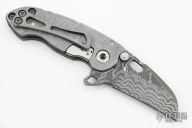 This Mini Solo Flipper by Direware features a Chad Nichols San Mai Damascus blade with notched thumbrest and a flipper. The handle has a Chad Nichols Damascus frame, backspacer and tip up clip, titanium pivot. Rides on bearings, nice detent, lockup and blade seating. Excellent condition.