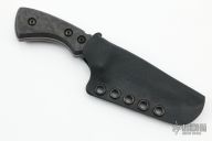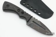 This knife by A2D Mercantile features an acid tumble finished blade with false top edge and notched thumbrest and fullers, .265" blade stock and 1.138" blade depth, full tang construction. The handle has marble carbon fiber scales. Comes with a kydex sheath. Light sheathing marks are visible on the blade otherwise the knife is in Excellent condition.