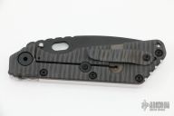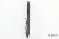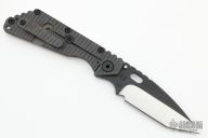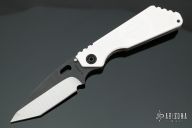This SMF by Mick Strider features a hand ground tanto blade with thumbhole and notched thumbrest. The handle features white and a tiger striped titanium frame with a matching tip up pocket clip.   Notches on thumbrest, rear of handle.  Includes lockbar stabilizer. Nice detent, blade seating and lockup. New condition from the 2022 CCKS. This was the show special