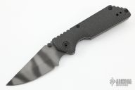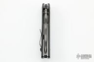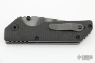 This AR folder by Strider features a tiger striped clip point blade with dual thumbstuds and a notched thumbrest. The handle has ribbed carbon fibers scales, tumbled titanium liners and black stainless clip. Notches on thumbrest, lockup and rear of handle. Marked 000 on the blade. New Condition.