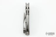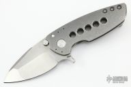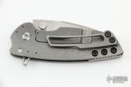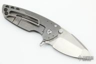 This Hyper 90 from Direware Custom Knives features a two-tone blade with satin finished grinds and tumbled flats, notched thumb rest, flipper and dual thumb studs. The handle is comprised of a tumbled titanium frame, and matching clip and backbar. Comes with original box. Excellent condition.
