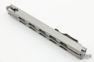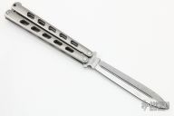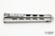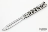 This Arc Angel by Cold Steel features a satin finished double-edged blade with fullers. The handles are satin finished titanium with a titanium T-latch at the butt. Light oxidation and scratches are visible on the blade otherwise the knife is in good condition.