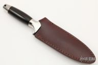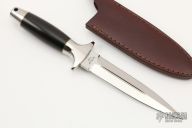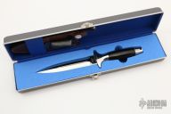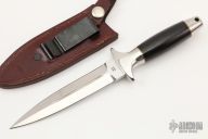 This Trooper by Kershaw Knives is a mirror polished double-edged dagger with fullers, .222" blade stock and .943" blade depth, hidden tang construction. The handle has a stainless steel guard and butt with wood grip and brass spacers, lanyard hole at the butt. Comes with a brown leather sheath and original box.  S/N 22349.  Excellent Condition.
