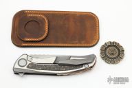 This Hati CCKS-Spring Edition by Shirogorov Knives features a stonewashed blade with notched thumbrest and flipper. The handle has a bronze marble carbon fiber and stonewashed titanium frame with matching tip up clip, bronze backspacer with lanyard hole. Rides on bearings, nice detent, lockup and blade seating. Comes with COA #37, Cova Leather Pouch, and a HiTex Antique Bronze Shirogorov Chip with original box. New from maker at the 2022 CCKS.